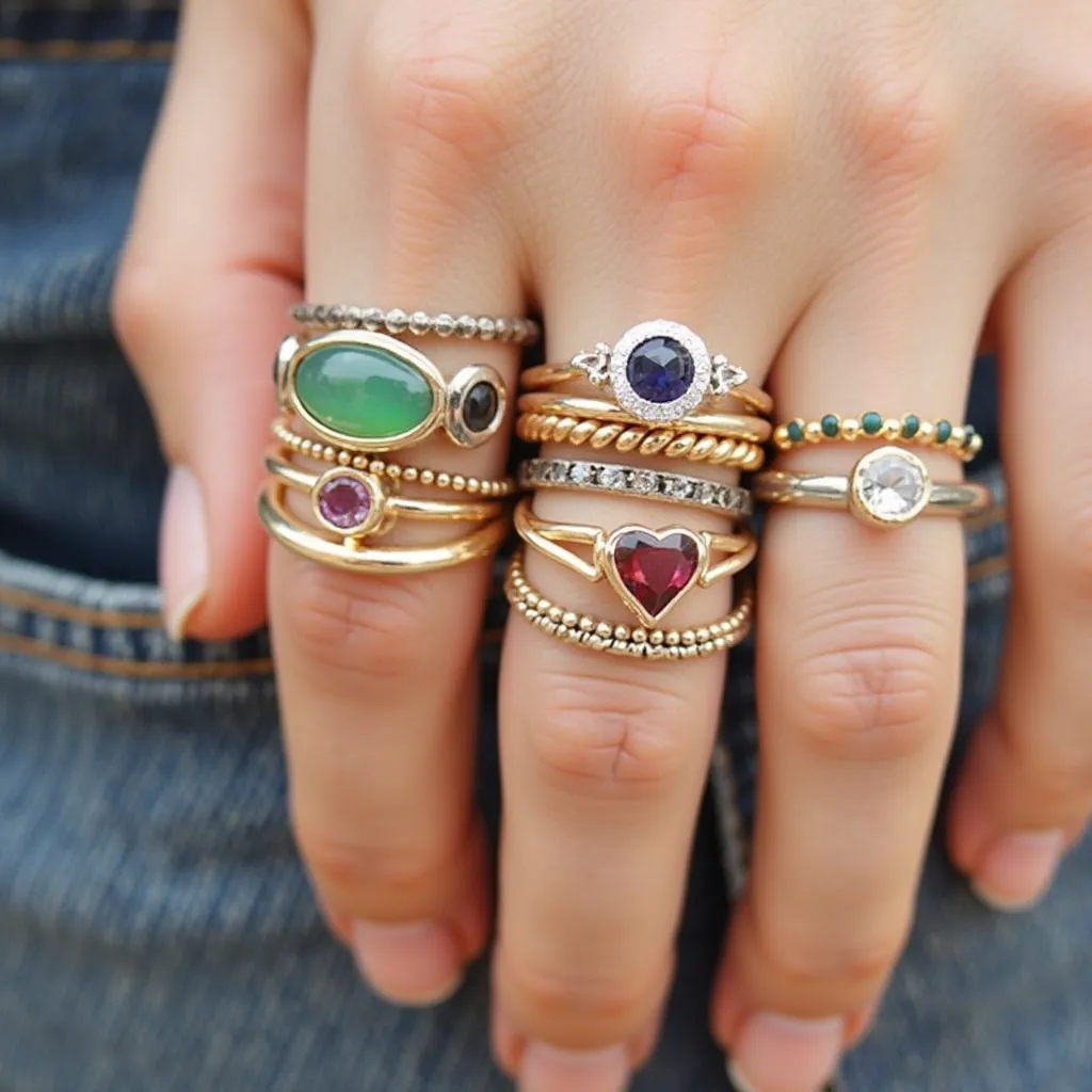 Stack rings of different sizes on multiple fingers, mixing metals and gemstones for a bohemian-meets-rockstar aesthetic.