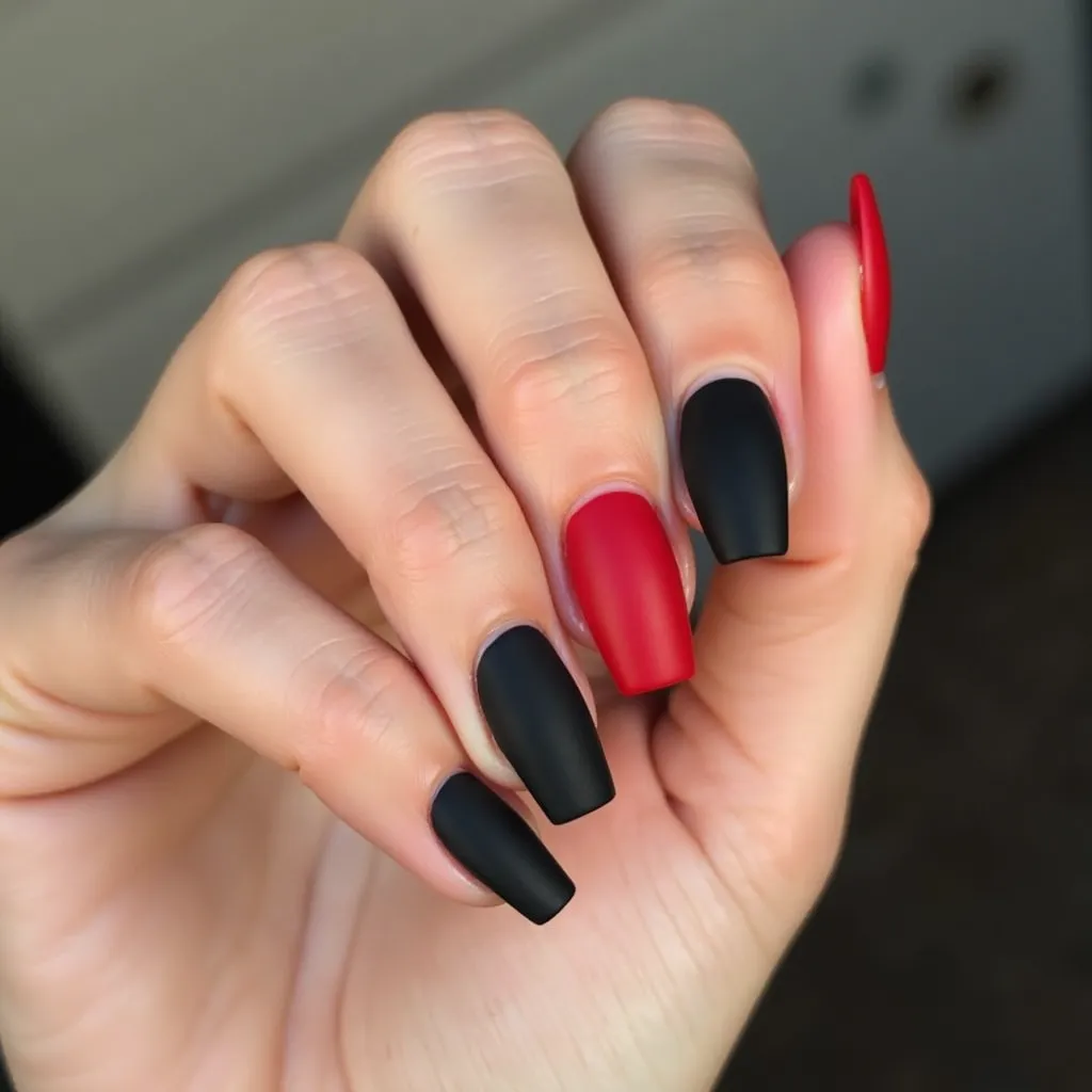 Choose bold nail colours like matte black, oxblood, or dark green for a striking contrast to soft, earthy tones.