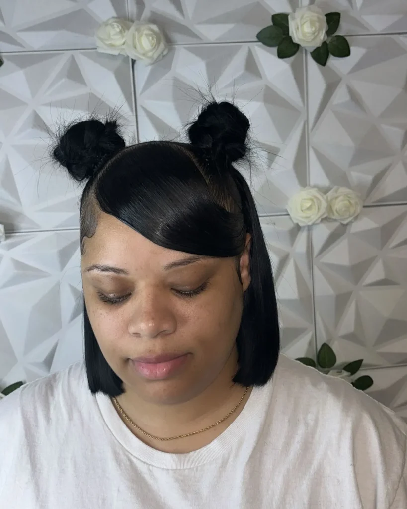 Tie half of your hair into small, imperfect space buns, leaving some strands down for an effortless yet edgy finish.
