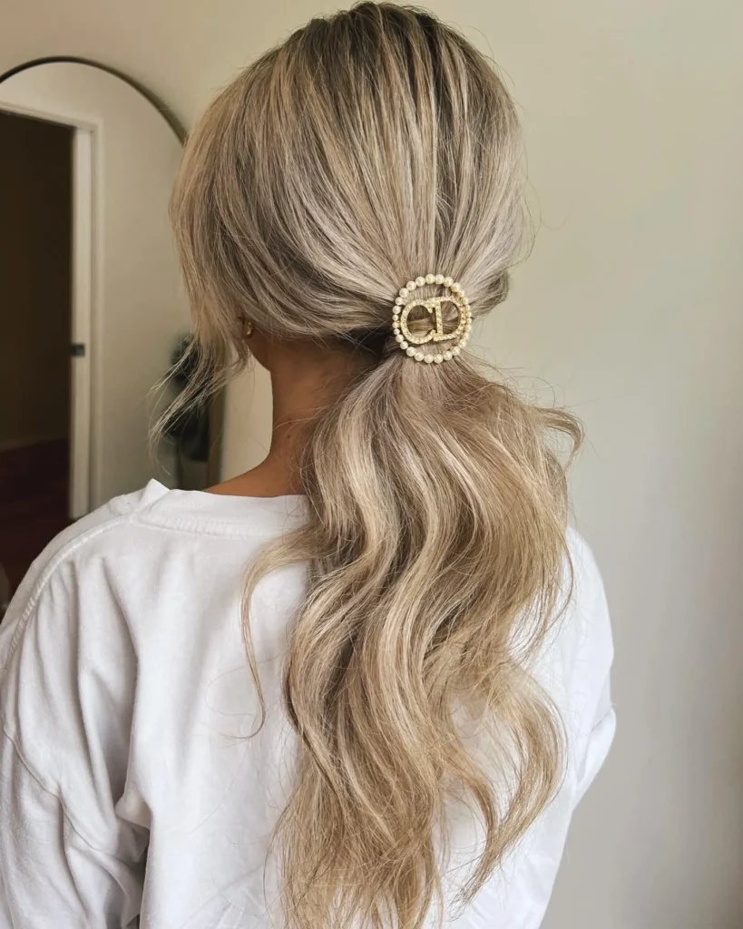 • How to Get the Look: Secure your hair in a low ponytail at the nape of your neck. Take a small section of hair from the ponytail and wrap it around the hair tie to conceal it, securing with a bobby pin.