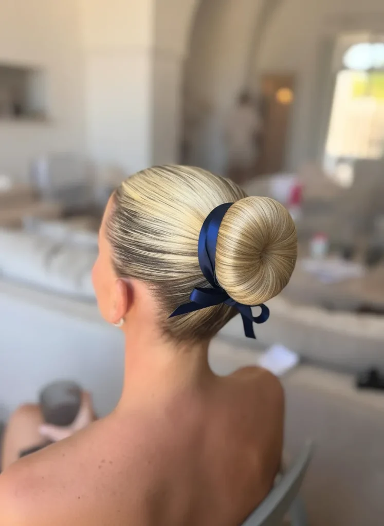 - Real Talk: How to Get the Look: Pull hair into a sleek high or mid-level ponytail. Twist the pony and wrap it into a tight bun, securing with pins. Take a long, thin ribbon (velvet or silk) and wrap it around the base of the bun several times before tying it into a neat, small bow.