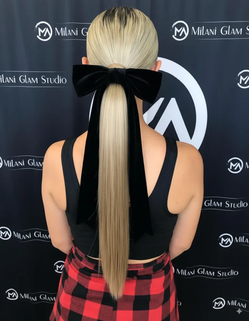 A bow can hide a messy elastic, add volume to a simple style, and turn a two-minute ponytail into a deliberate, party-ready look. It’s the MVP of holiday accessories.
