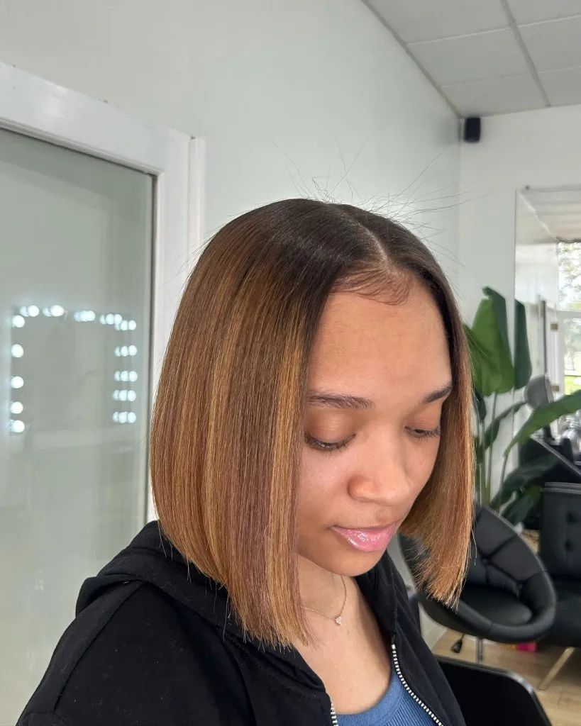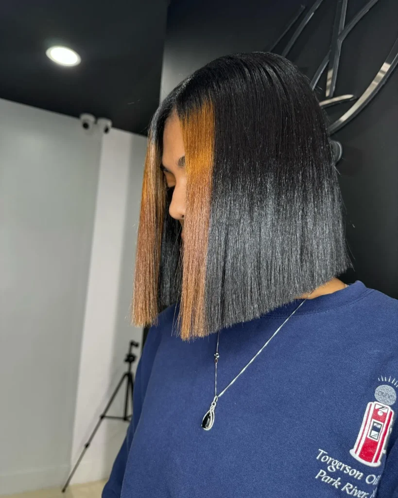 - Visual Vibes: Sun-kissed dimension. Highlights woven through a silk press catch the light beautifully, adding depth, texture, and a radiant glow to the hair.