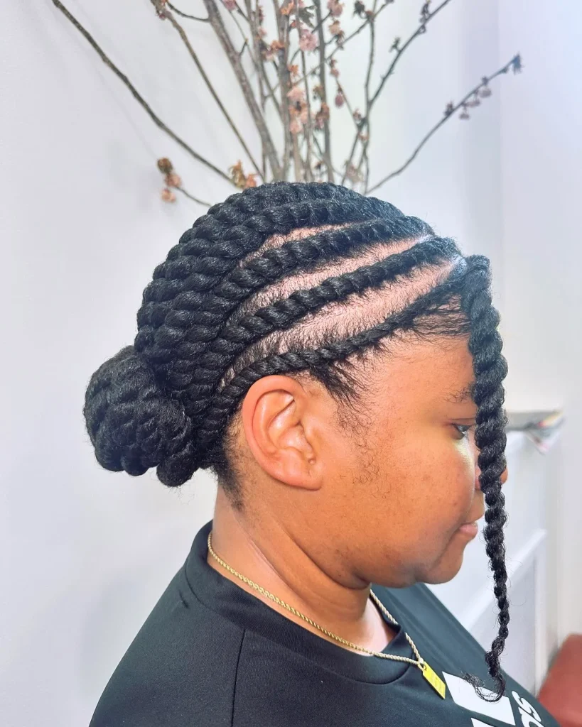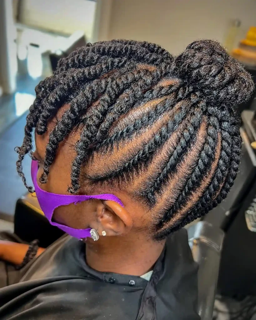 Combine sleek cornrows at the front/sides with a full bun at the crown.