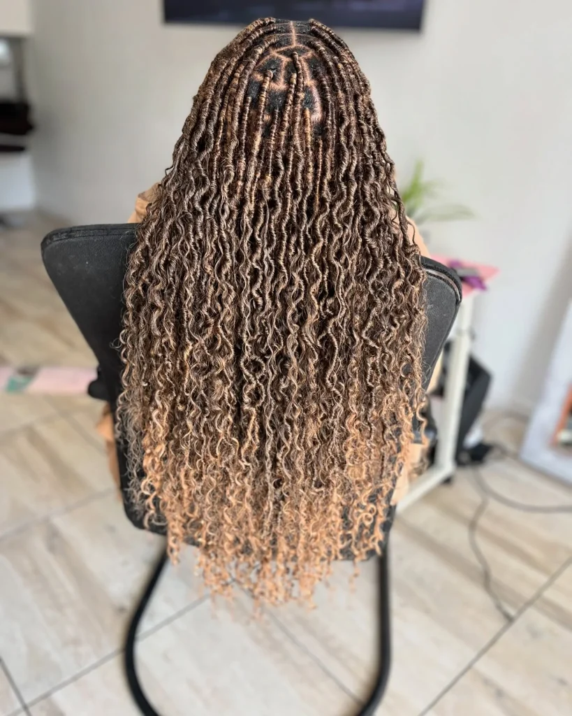 These are faux locs with curly or wavy hair integrated, often left out at the ends.
