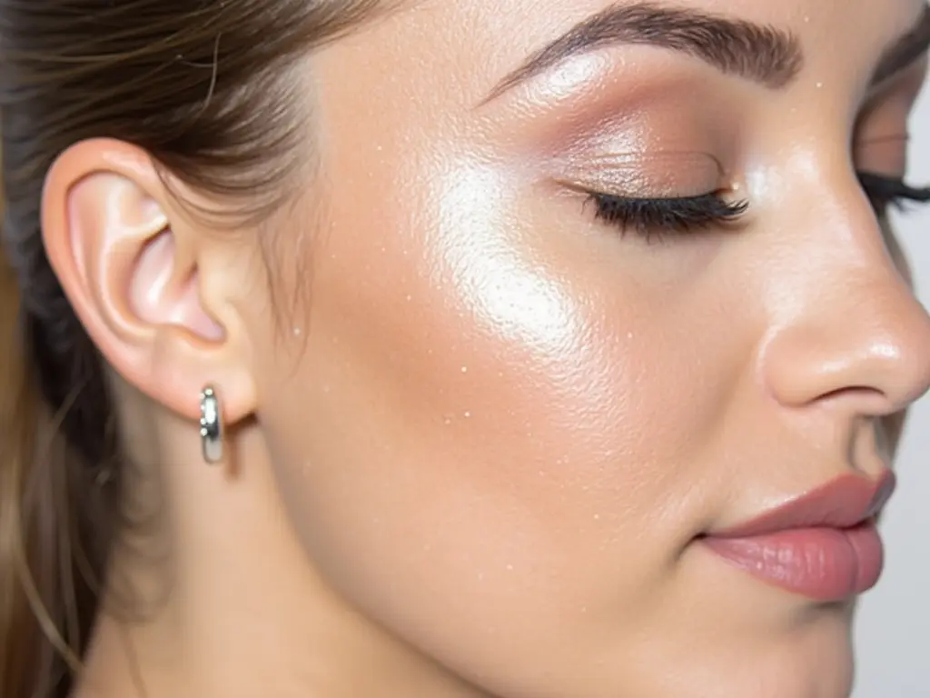 Apply pearlescent highlighter to the cheekbones and nose for a soft, dewy glow.