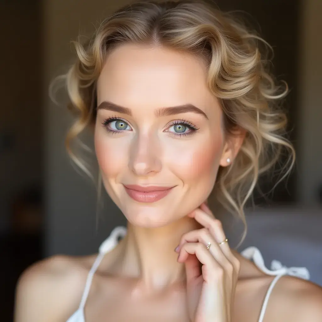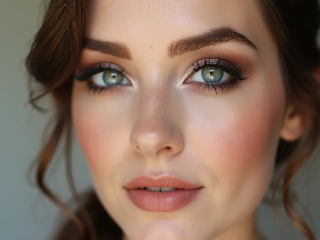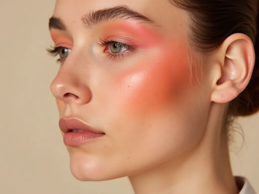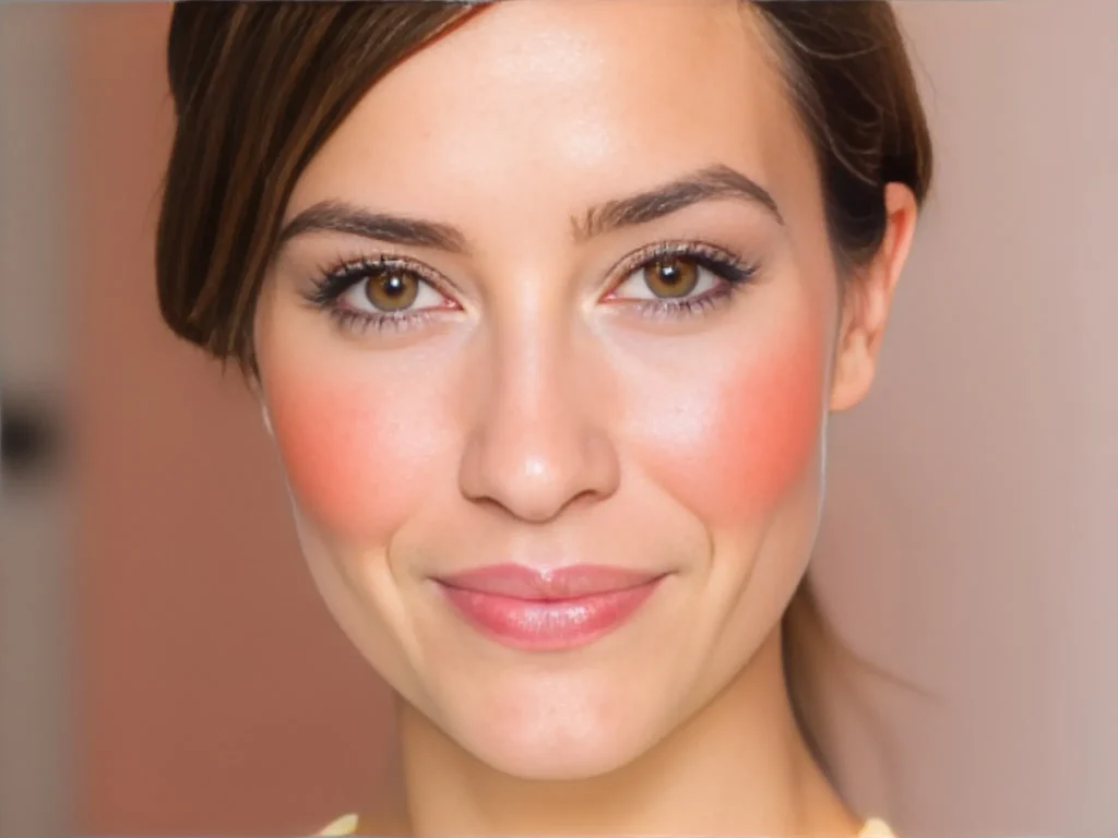 Apply a rosy or peach-toned blush high on the cheeks, extending toward the temples for a romantic, natural flush.