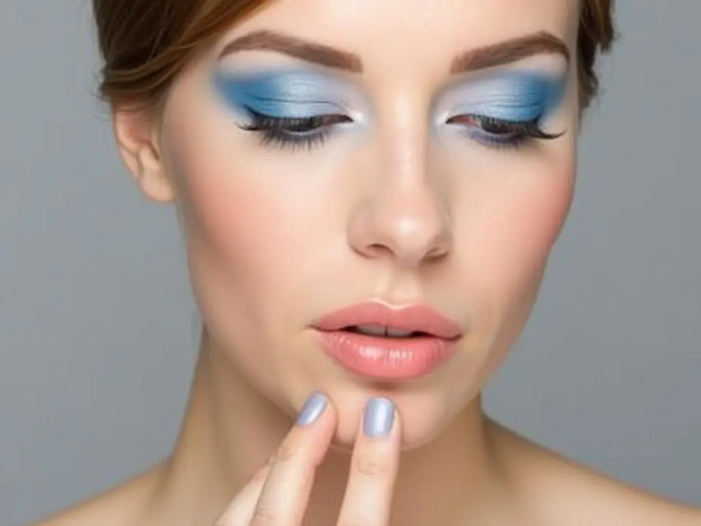 Apply soft blue eyeshadow across the lids, pairing it with a sheer pink lip for a graceful, noble look.