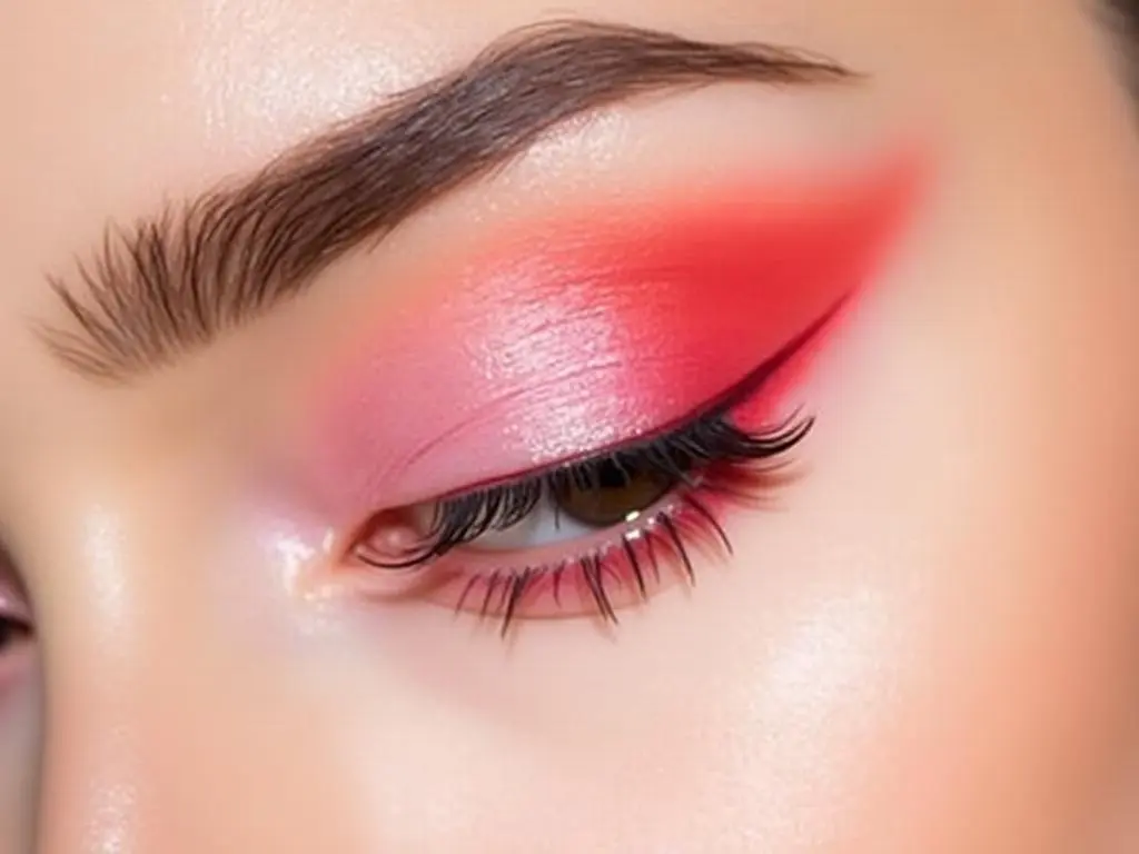 Create a seamless blend of pink and soft red across the eyelids for a delicate, watercolor effect.