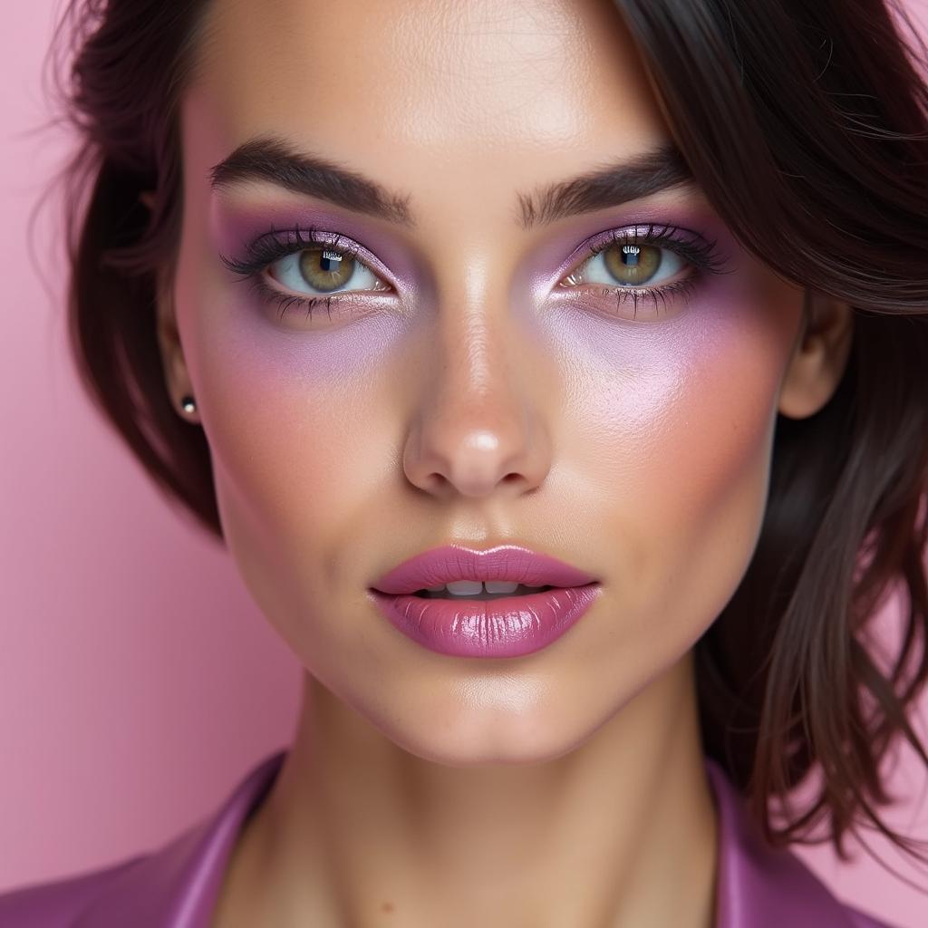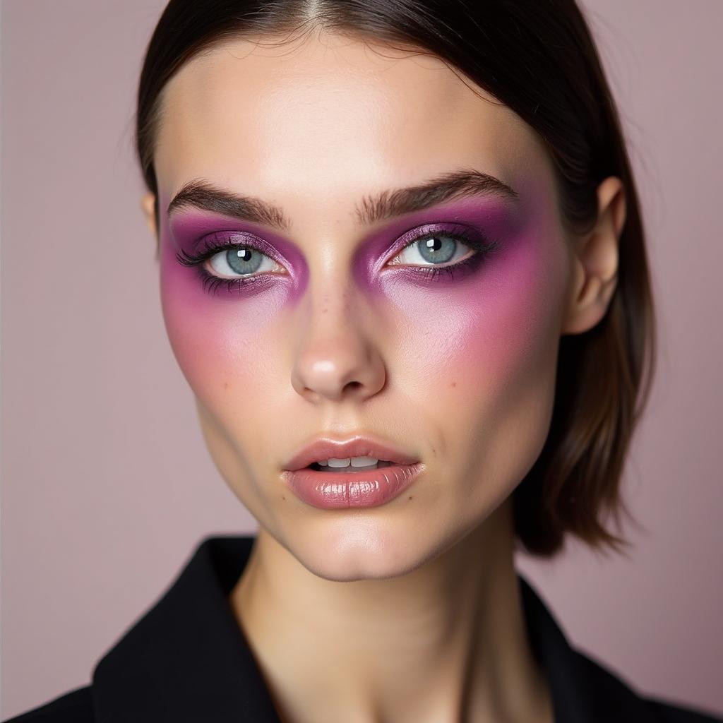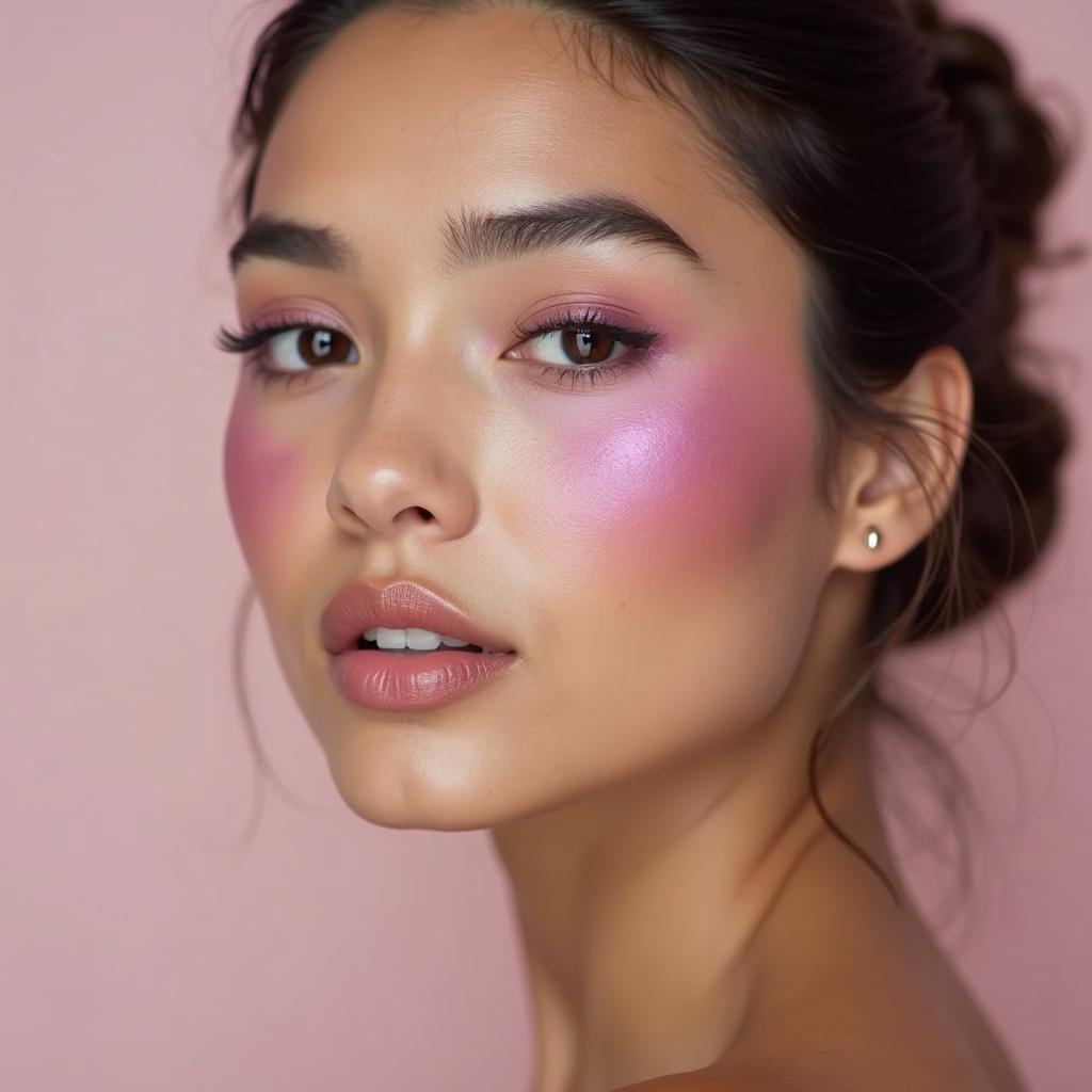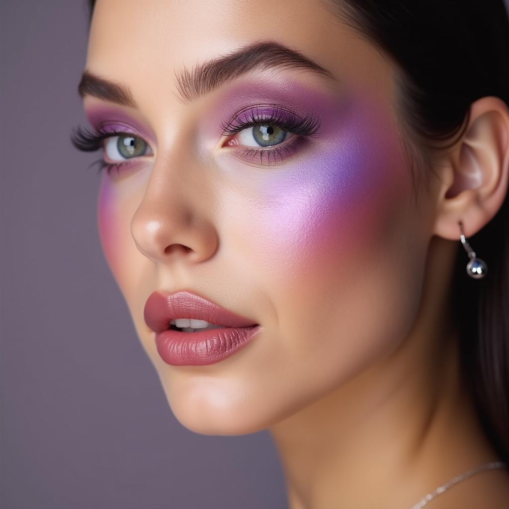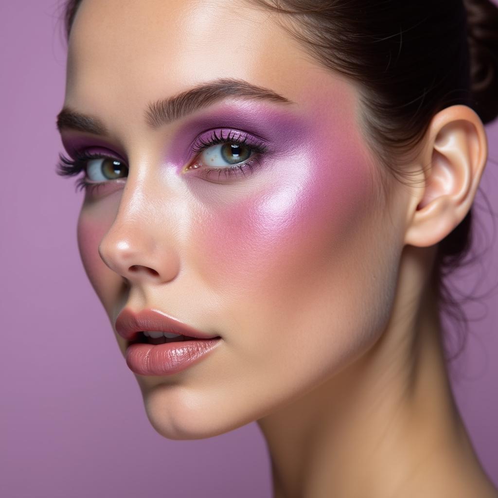 Sweep a bold violet blush along the cheekbones for a dramatic, high-fashion statement. Pair it with a neutral lip color to balance the look.