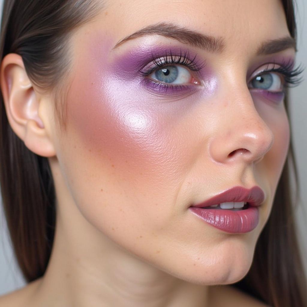 Layer a pearl or silver-toned highlighter over your purple blush for a radiant, ethereal glow.