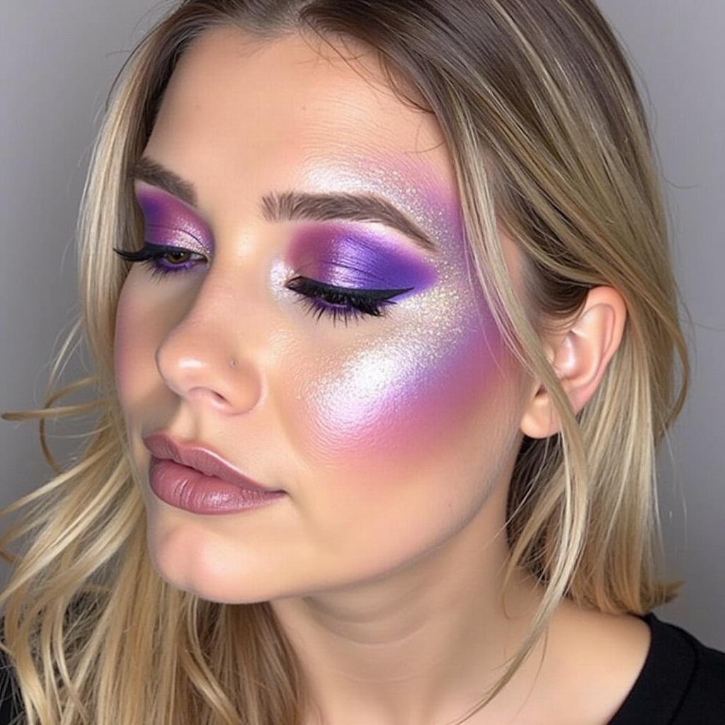 Combine bold purple blush with a holographic highlighter for a cosmic-inspired makeup style.