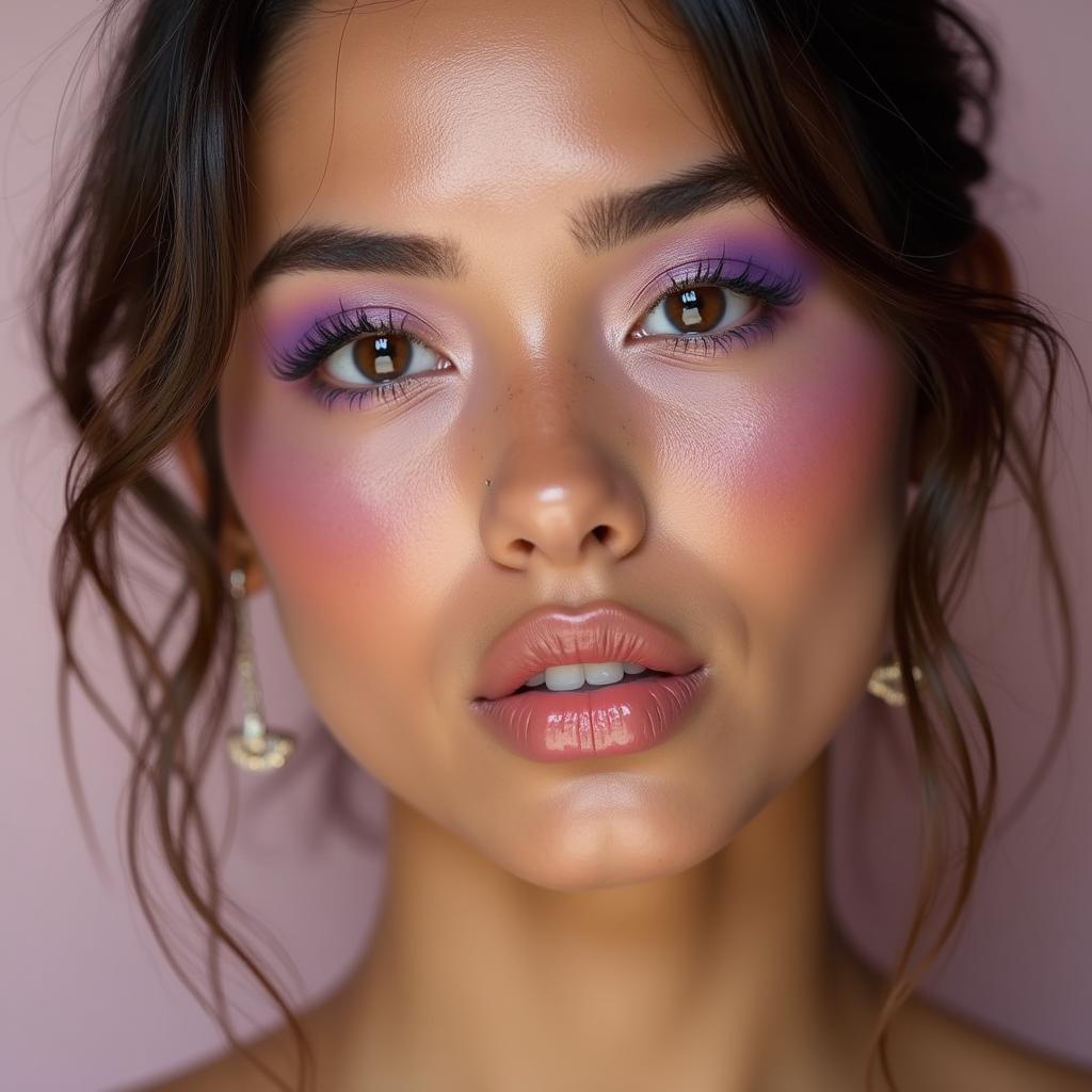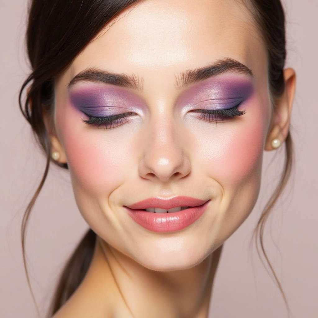 Combine a soft lilac blush with a hint of highlighter for a frosted, luminous finish that’s perfect for daytime events.