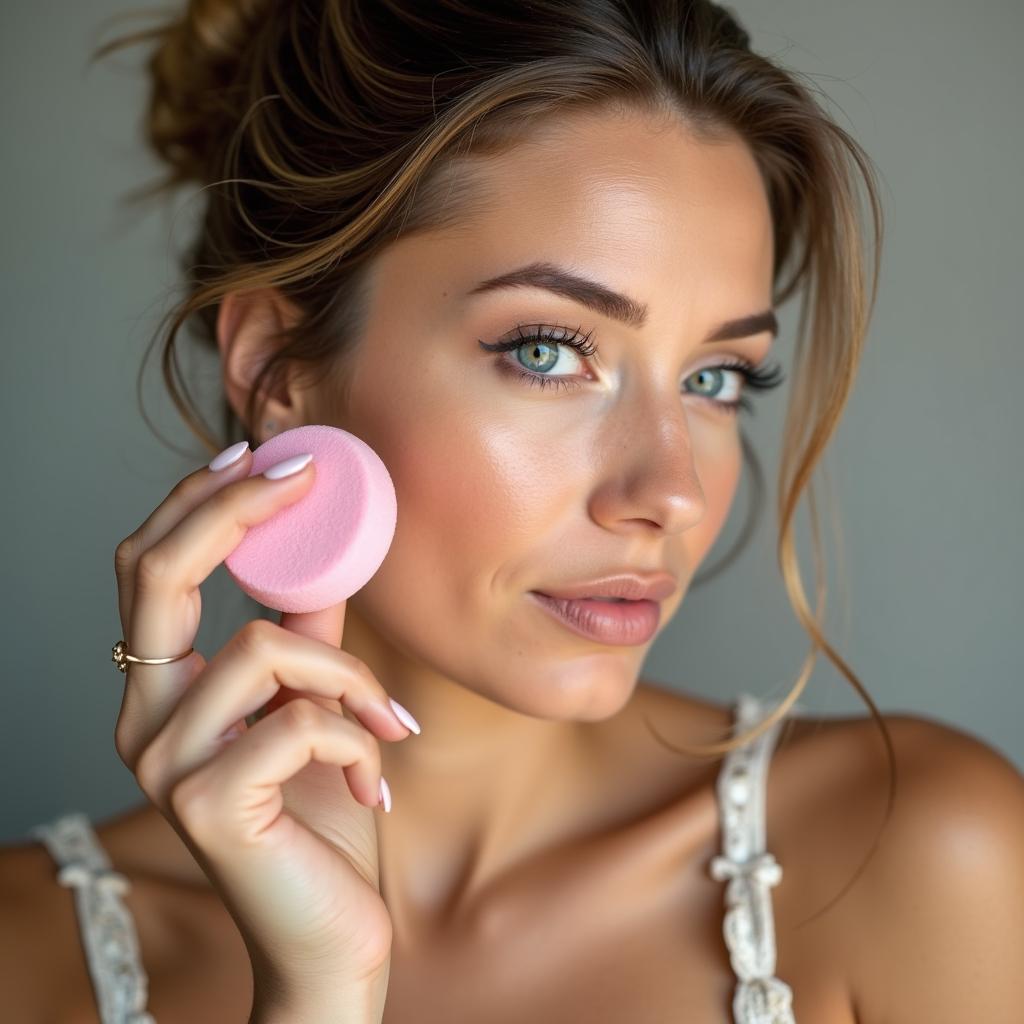 A damp makeup sponge helps blend liquid or cream highlighter for a seamless glow.