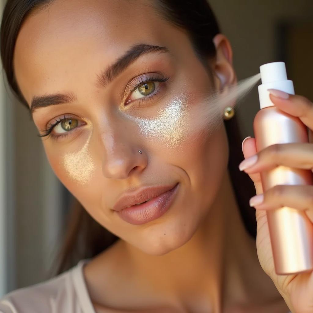 Spray your face with setting spray and gently pat highlighter onto your skin for a long-lasting glow.