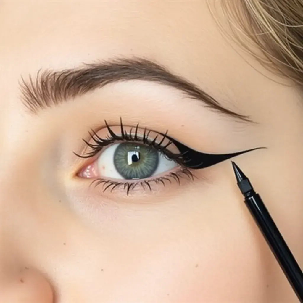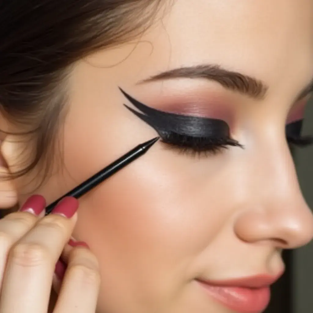 Draw extra-long, exaggerated winged eyeliner for a sharp and dramatic look.