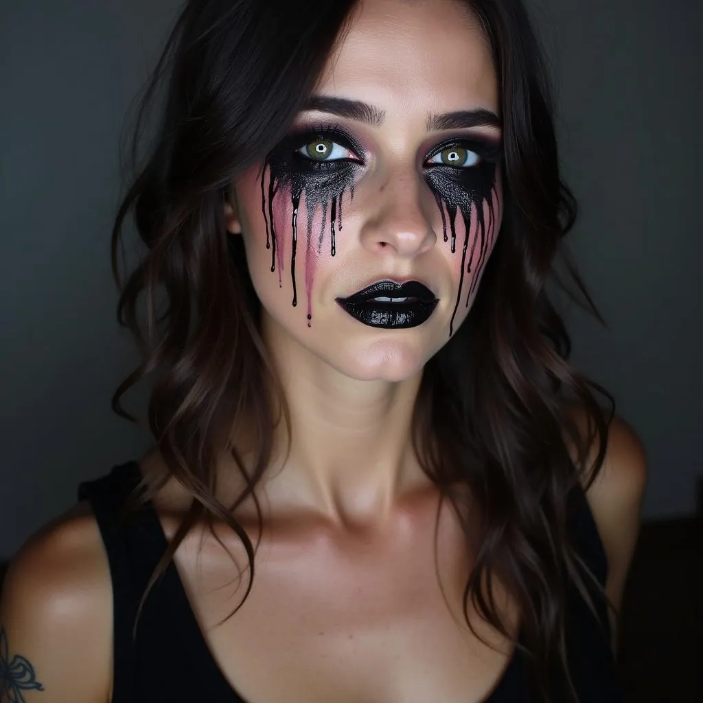Use dark, glossy pigment to create the effect of dripping or smudged makeup for a haunting, sorrowful beauty.