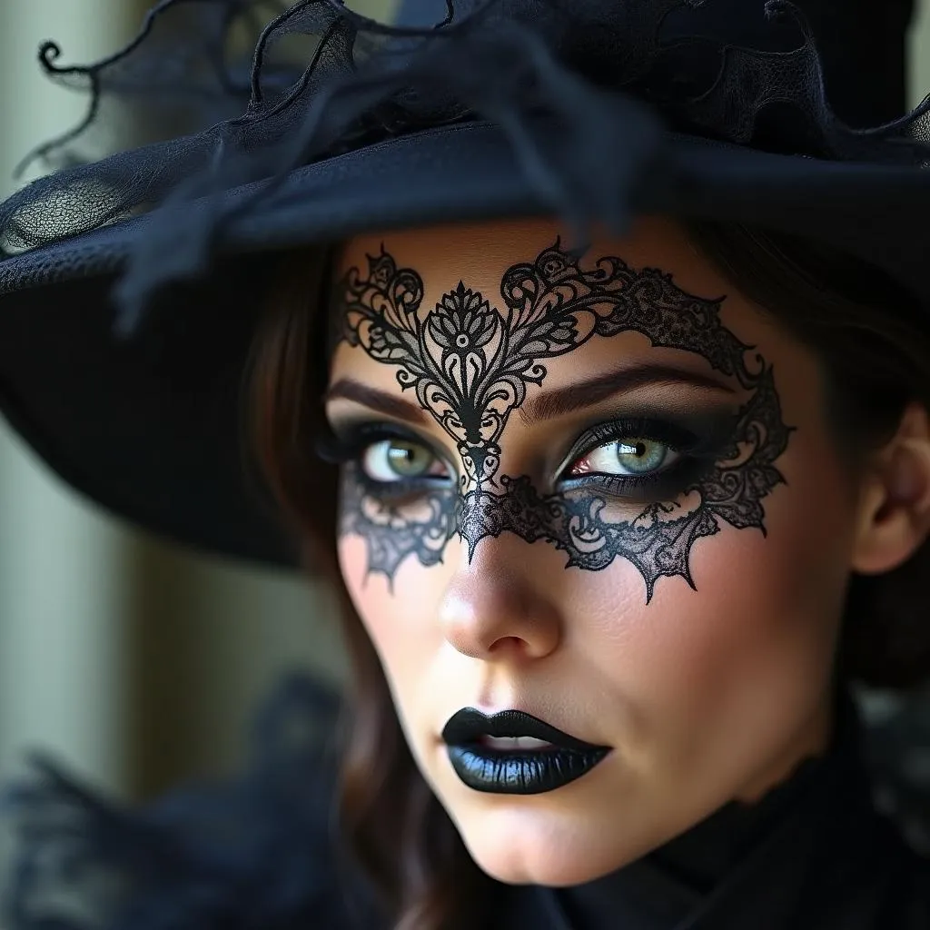 Create delicate lace or veil-like designs with eyeliner for a Victorian witch-inspired aesthetic.