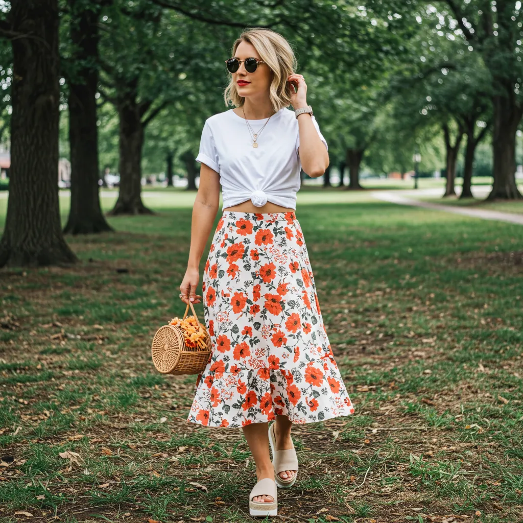 - How to Style It: Choose a flowy floral skirt and pair it with a simple white or graphic tee. Knot the tee at your natural waist to create definition and a flattering silhouette. Platform sneakers or espadrilles complete this fun, youthful look.