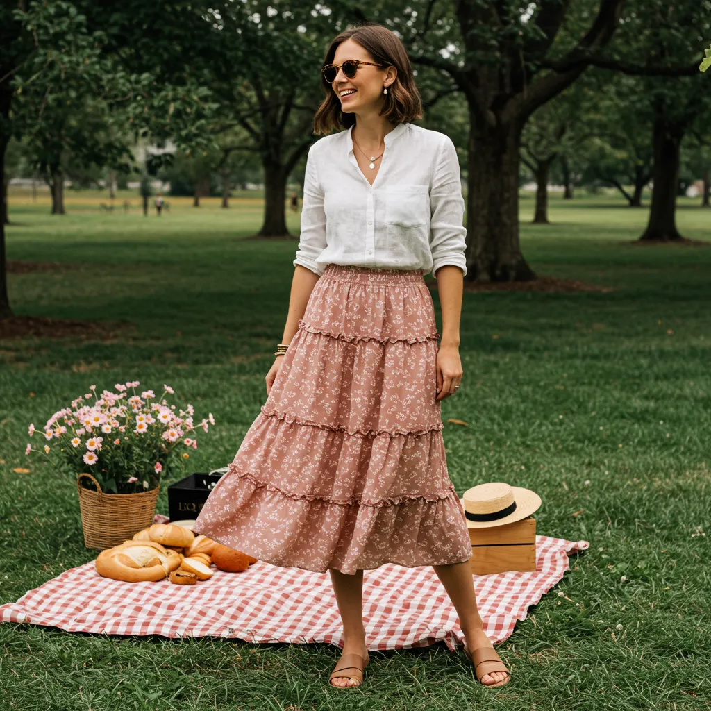 - Why It Works for a Picnic: A tiered midi skirt offers wonderful volume and movement, creating a romantic silhouette that’s also incredibly comfortable for lounging. Pairing it with a simple blouse creates a two-piece look that feels intentional and put-together.