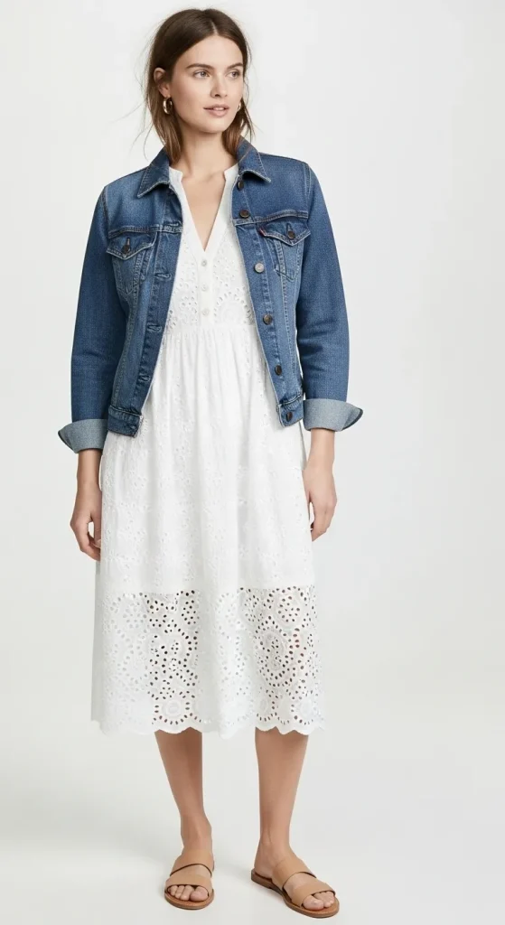 - How to Style It: Let the texture of the dress be the star. Pair it with simple tan or beige leather sandals. If a breeze picks up, a denim jacket provides a lovely textural contrast between the rugged twill and the delicate eyelet.