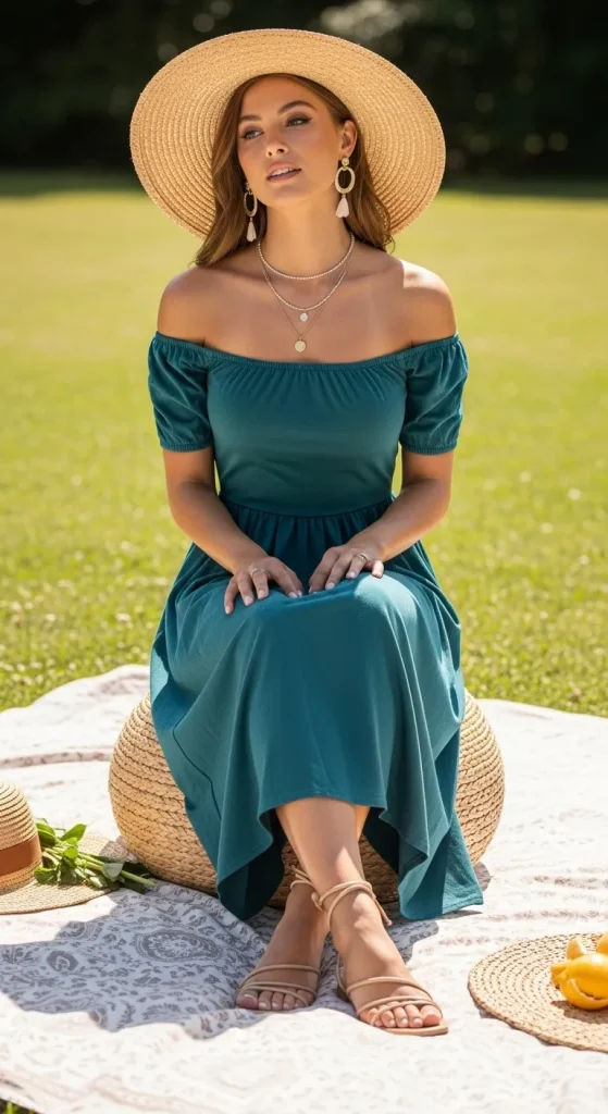 - Why It Works for a Picnic: An off-the-shoulder neckline is a beautiful way to show a little skin in a sophisticated way. It feels romantic and perfect for a sunny day. A midi length keeps it elegant and practical for sitting on a blanket.