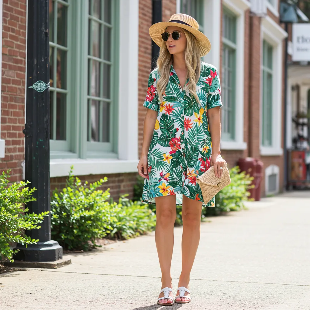 • Key Pieces: A tropical print dress, shirt, or matching set.