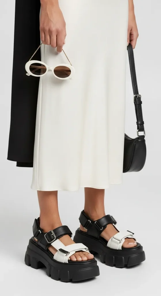 • Strategic Value: The right shoe can completely transform a look. A chunky sandal instantly modernizes and adds a cool, grounded feel to feminine pieces like sundresses and slip skirts. They are also incredibly comfortable for walking.