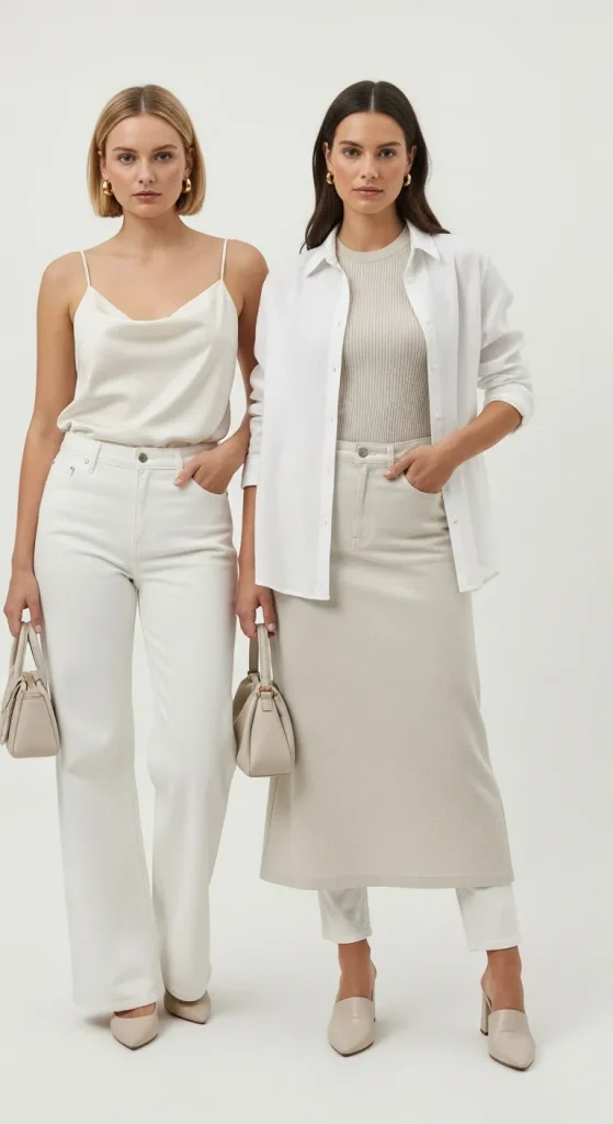 • Styling Tip: Don’t be afraid to mix different shades of white. A creamy off-white top with stark white pants looks intentional and sophisticated.