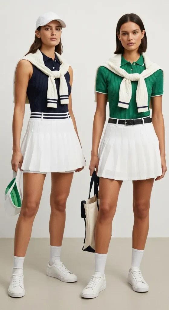 • Key Pieces: A pleated tennis skirt (usually in white), a fitted polo shirt or ribbed tank top.