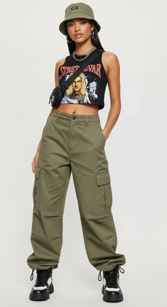 • Key Pieces: Loose-fitting cargo pants, a graphic tank top or fitted crop top.
