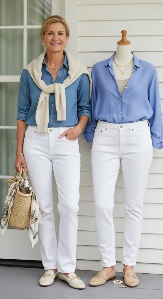 • Accessorizing the Look: A woven straw tote, leather loafers or sandals, a silk scarf, and simple pearl or gold jewelry.