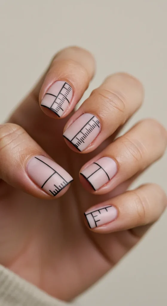 A design that uses your bare nail as the background, with small black lines painted near the free edge like a ruler. The strategy is high-concept minimalism. It is clever and chic.