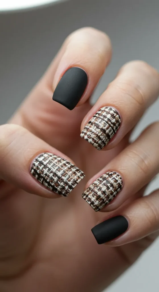 A pattern that mimics the texture of tweed fabric, usually in a neutral palette of black, white, and gray. The strategy is to add a textural, scholarly element. It’s the nail equivalent of a professor’s blazer.