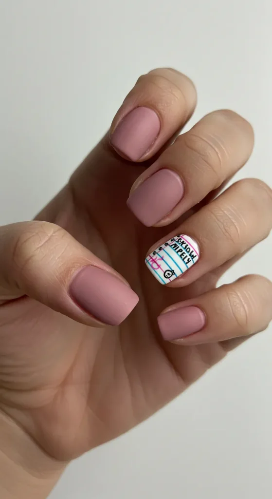 Request a “notebook paper design” on an accent nail. Emphasize a clean white base and extremely thin lines for a refined look.