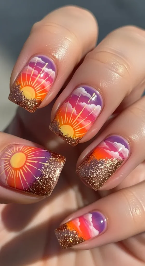Picture this: the sky blushing with pink, orange, and a deep, dusky purple, all melting into each other. Now, put that on your nails. That’s the sunset aura. It’s the literal embodiment of an August evening.