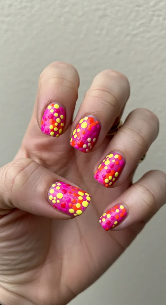 End the summer with a burst of pure joy. “Dopamine dressing” was all about wearing bright colors to boost your mood, and this is the nail art equivalent. On a nude or clear base, add a playful scattering of dots in various bright, happy colors.