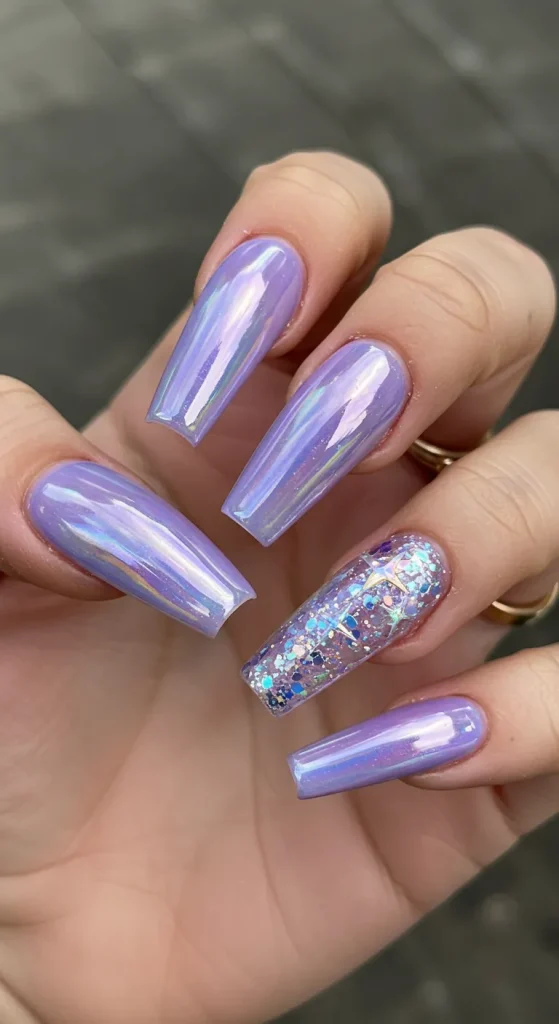 This isn’t a loud, glittery purple. It’s a soft, milky lavender base with a pearlescent, slightly blue-shifting chrome powder on top. The effect is magical and otherworldly. It’s a pastel that’s been given a futuristic, ethereal upgrade.