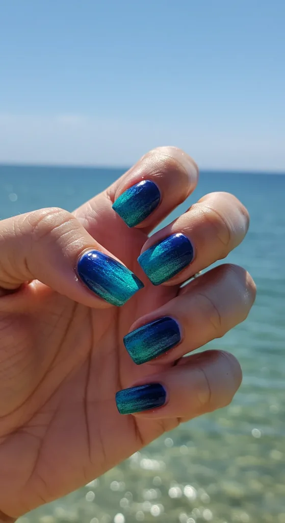 Pay one last tribute to the beach with a dramatic, deep ocean ombré. This isn’t your typical light-to-dark fade. This is a gradient that moves from a sandy nude at the cuticle into a deep, mysterious navy or teal at the tip.