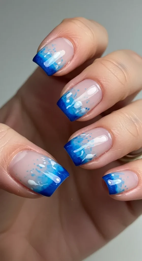 You can totally DIY this! All you need is a steady hand, a sheer nude or pink base, and a nail art brush with your chosen shade of blue. The key is to keep the line as thin and crisp as possible. If you’re at the salon, just ask for a “micro French” or “skinny French” with a bright blue tip.