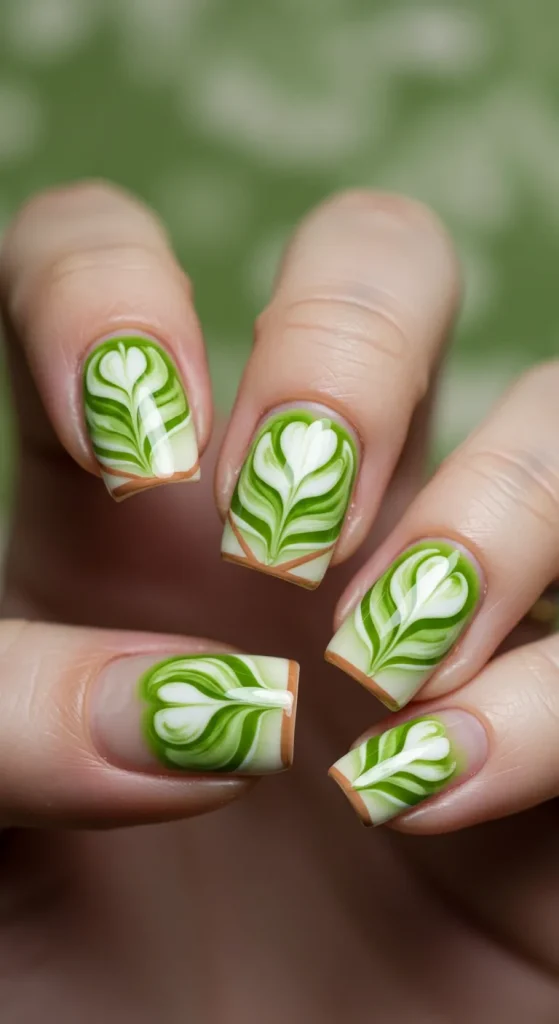 Think creamy, milky swirls of matcha and off-white on a clear or nude base. The abstract, marbled effect is calming and cool, just like your favorite morning drink. It feels fresh and modern while giving a subtle nod to the earthy tones of the upcoming autumn season.
