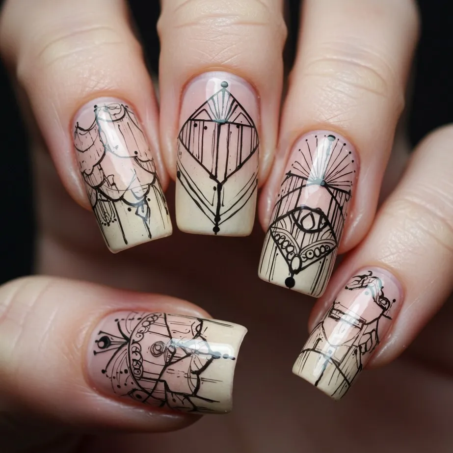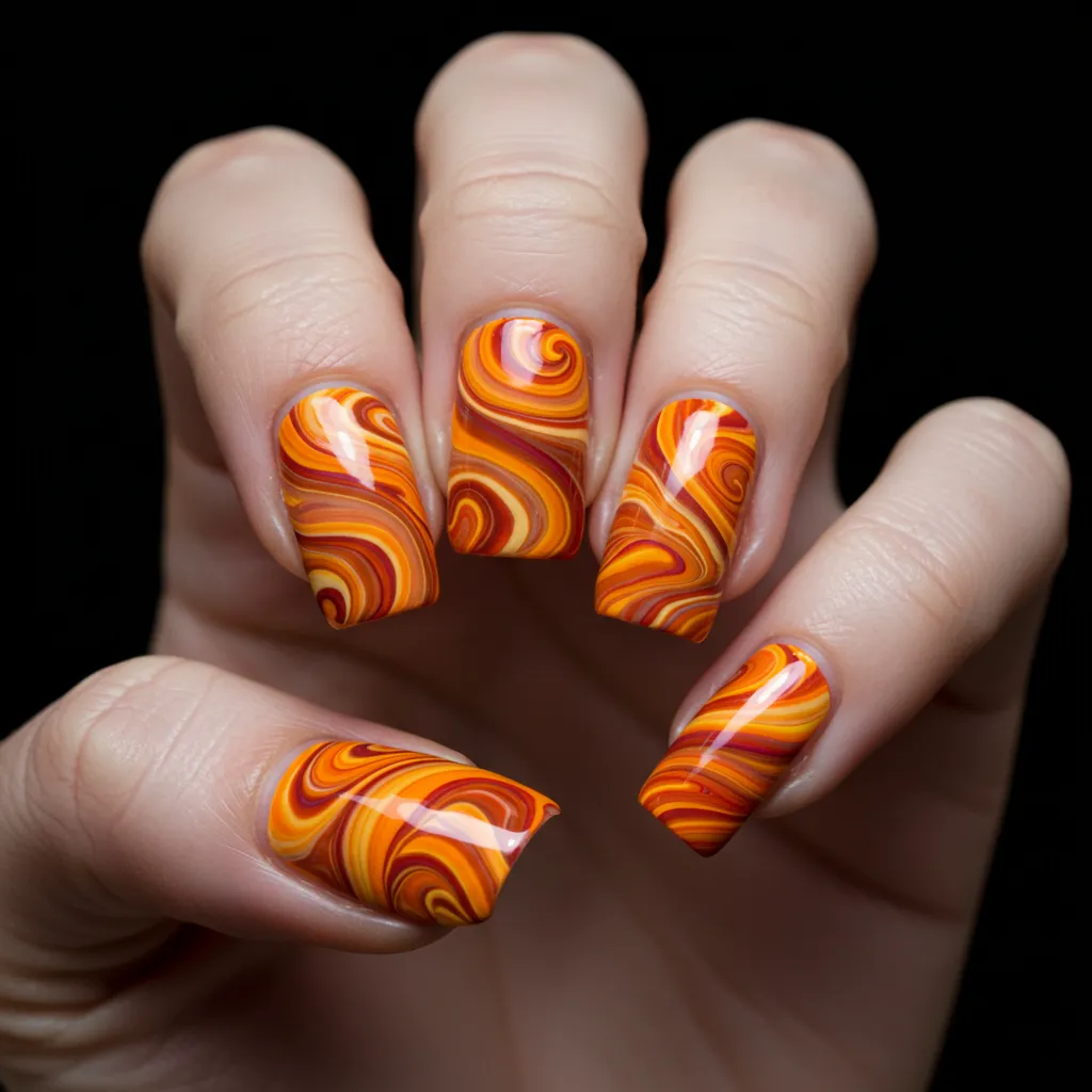 Think fluid lines and blended shapes in warm tones. Swirls of terracotta, blush pink, cream, and maybe a touch of gold foil, moving organically across the nail. No harsh lines, just soft, flowing movement.