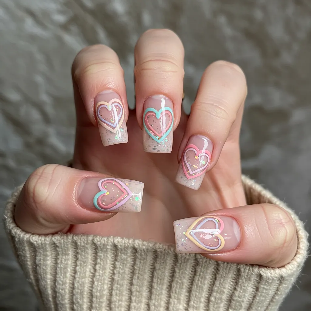 Think beyond single hearts. Design two simple heart outlines that slightly overlap or interlock on an accent nail. Use contrasting colors like pink and white, or a metallic on a nude base.