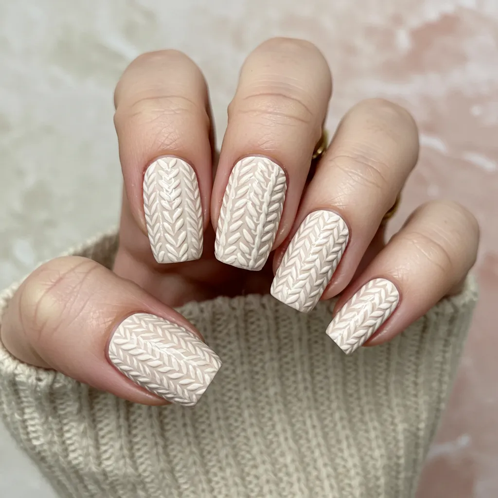 This is often achieved with 3D gel or dip powder, creating raised patterns over a matte base in cozy colors like cream, taupe, or dusty rose.