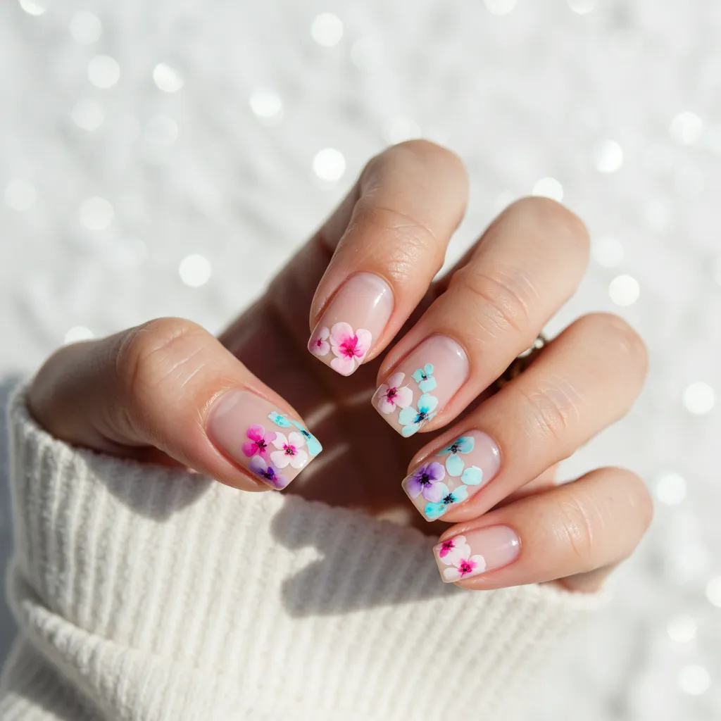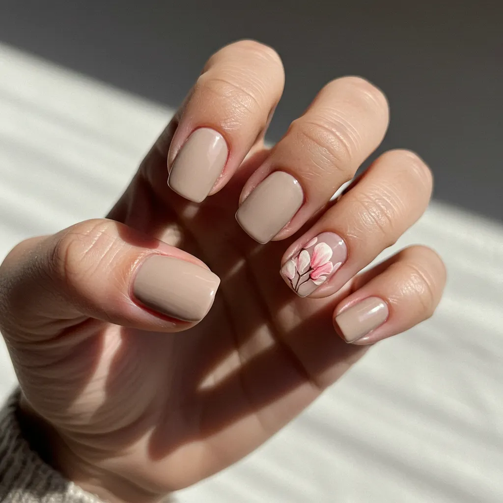 Okay, minimalist queens, gather ’round. Imagine a perfectly polished nude or soft pink base on most nails. But then, the ring finger? A single, delicately painted flower.