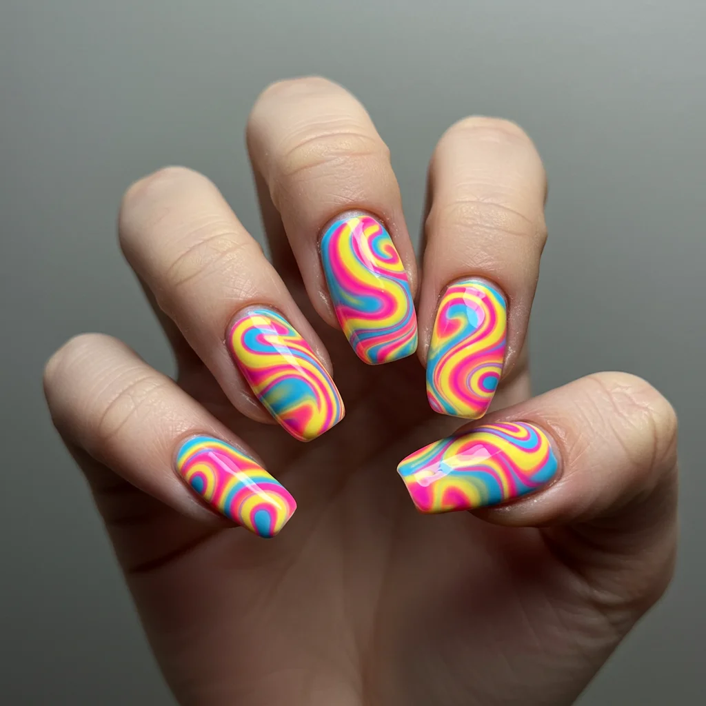 Why settle for one bright color when you can have them all? Neon swirls give your nails an energetic, psychedelic look that’s perfect for summer parties.