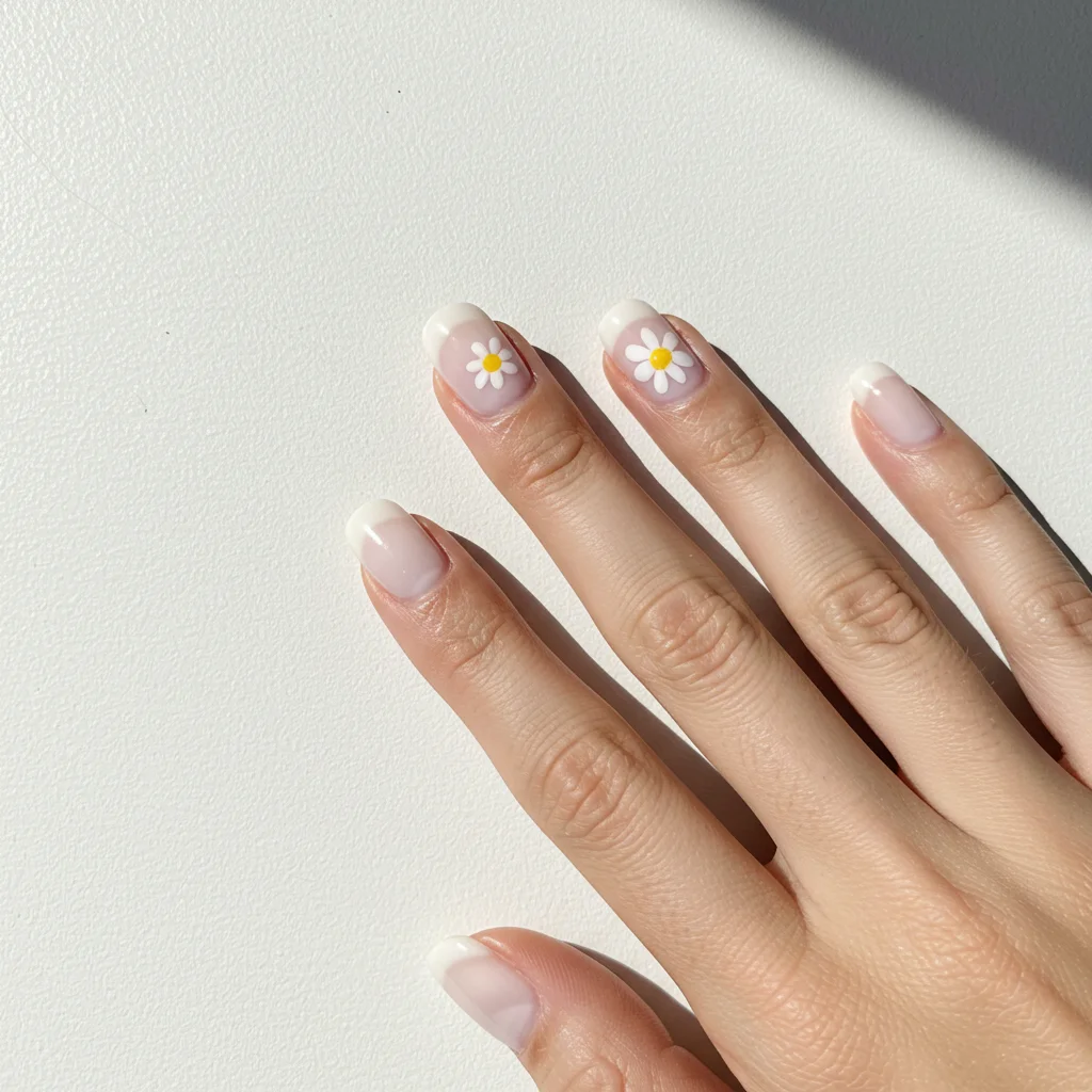 Tiny white daisies on a nude or pastel base give an effortlessly cute and fresh look.