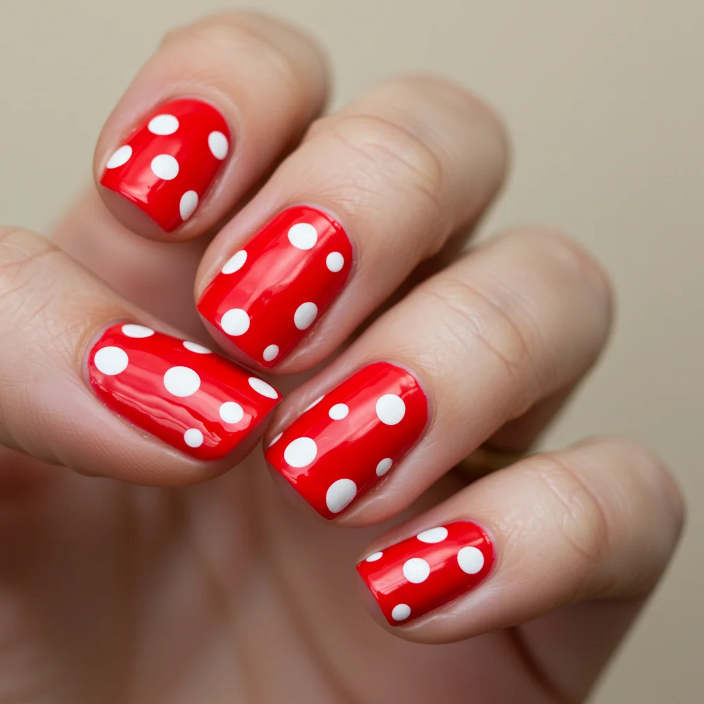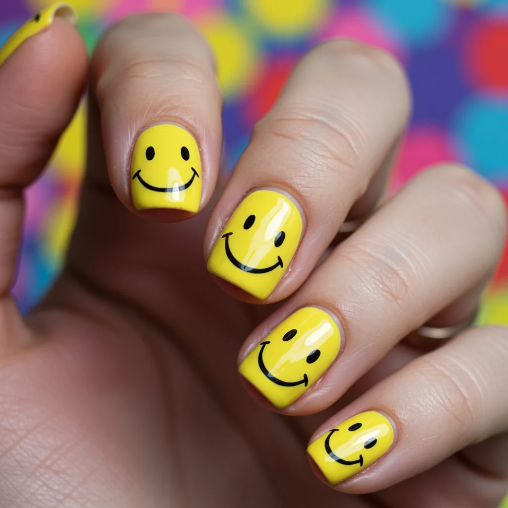 Add a touch of nostalgia with tiny smiley faces on a bright or pastel base. Cute, quirky, and full of good vibes.