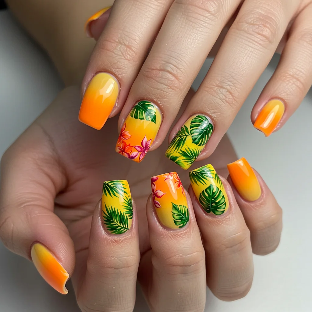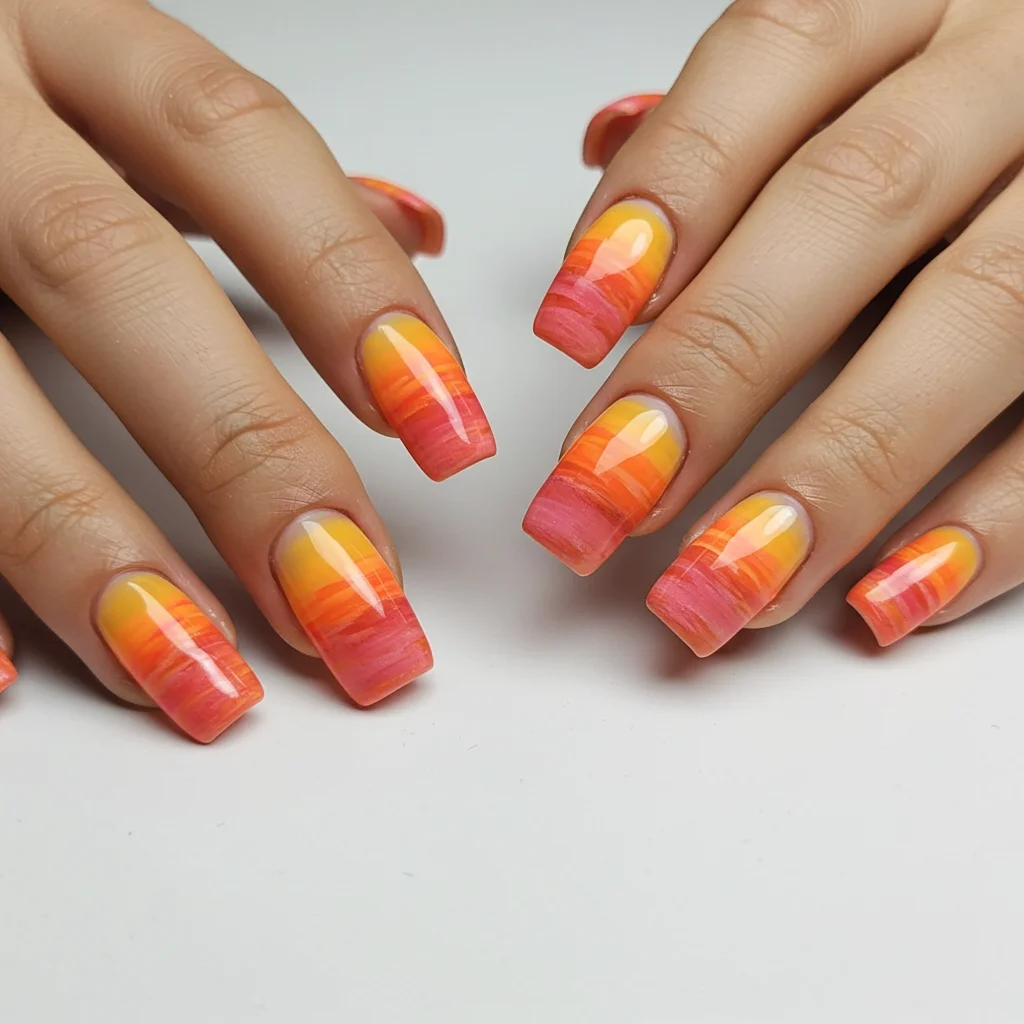Blend fiery oranges, pinks, and purples to create a stunning sunset effect right on your nails. Perfect for golden-hour selfies.