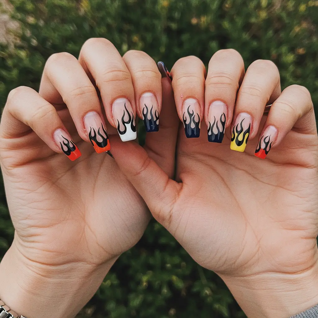 Rock fiery nails with the same flame design in different color variations to create a bold and striking look.